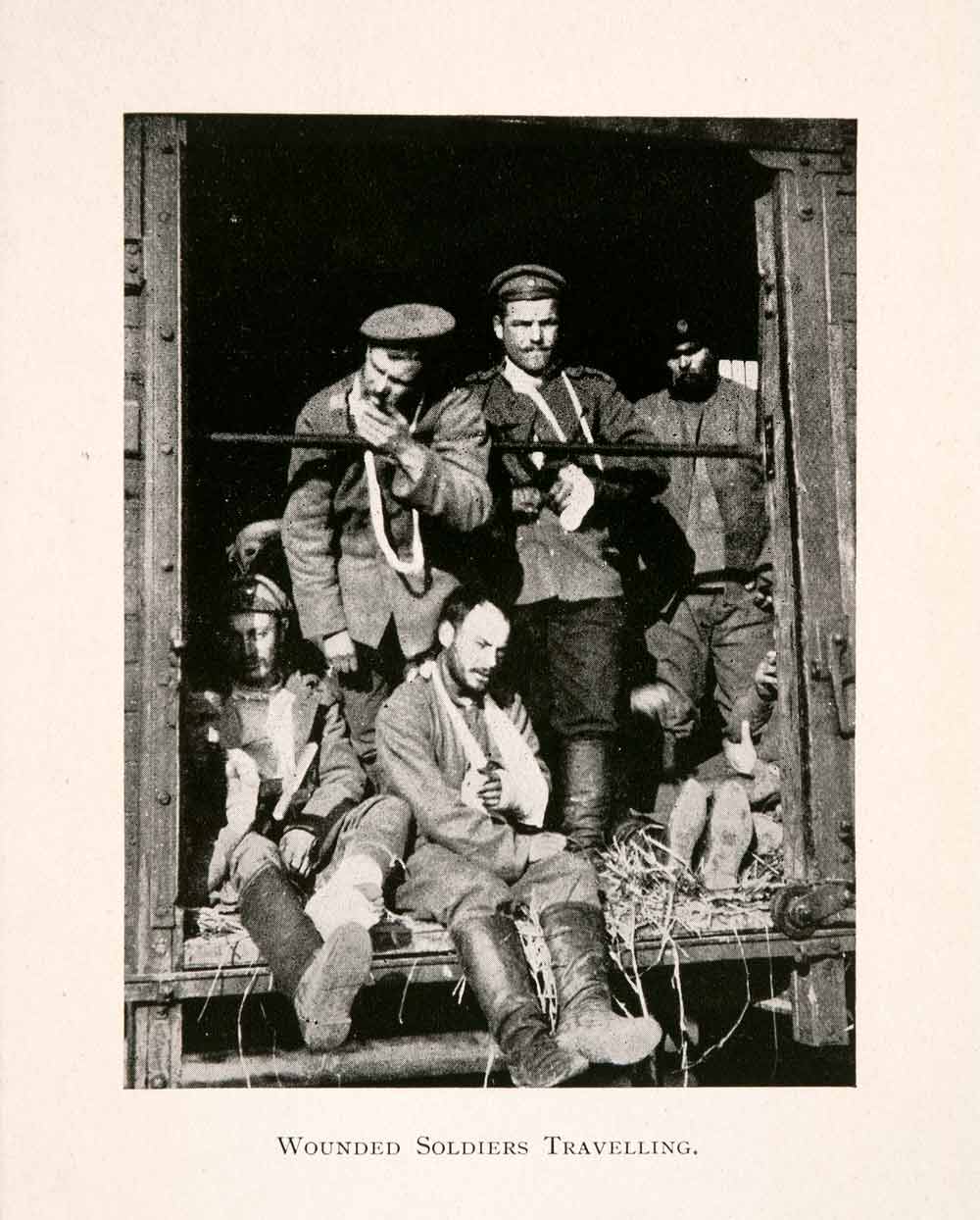 This is an original 1918 black and white halftone print of wounded soldiers traveling on a train.