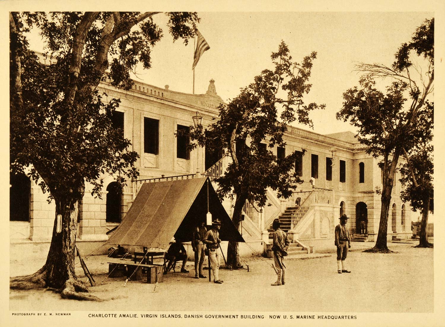 This is an original 1918 photogravure of the Danish Government Building in Charlotte Amalie, U.S. Virgin Islands, now U.S. Marine headquarters. Photograph by E. M. Newman. On the reverse is a short article about the history of the transfer of the Danish West Indies to the United States. Please see both images.