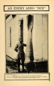 This is an original 1918 halftone print of an unexploded bomb in Nancy, France. The German bomb failed to explode on the French city.