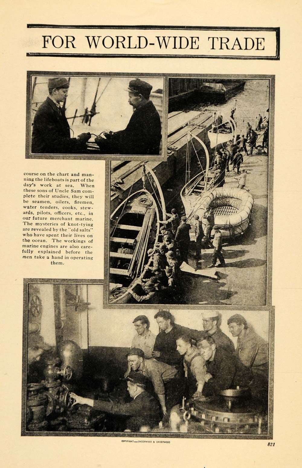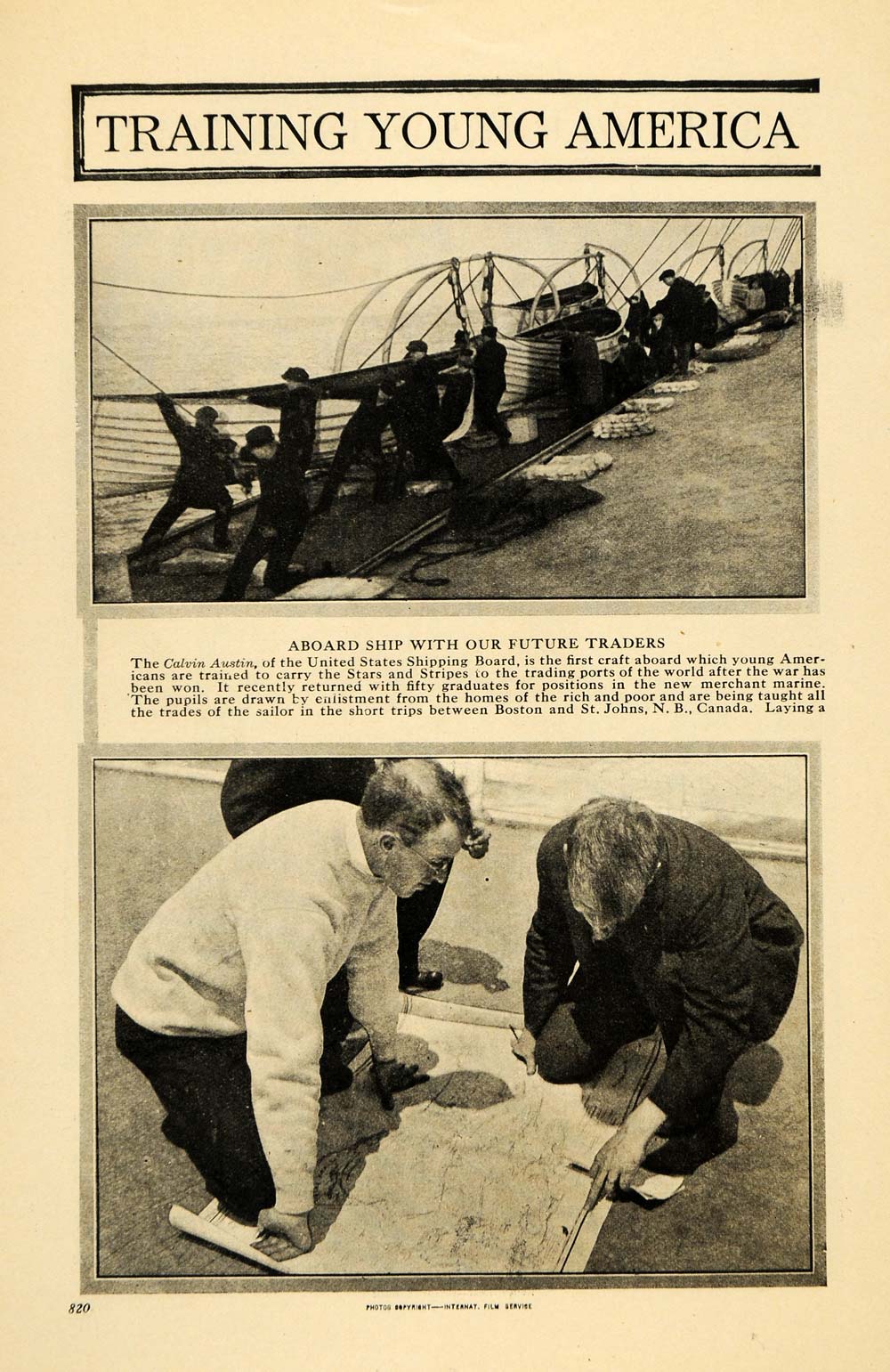 This is an original two-page 1918 halftone print of images of the Calvin Austin ship and the training of young soldiers. The caption reads, "The Calvin Austin, of the United States Shipping Board, is the first craft aboard which young Americans are trained to carry the Stars and Stripes to the trading ports of the world after the war has been won." Please see additional images.