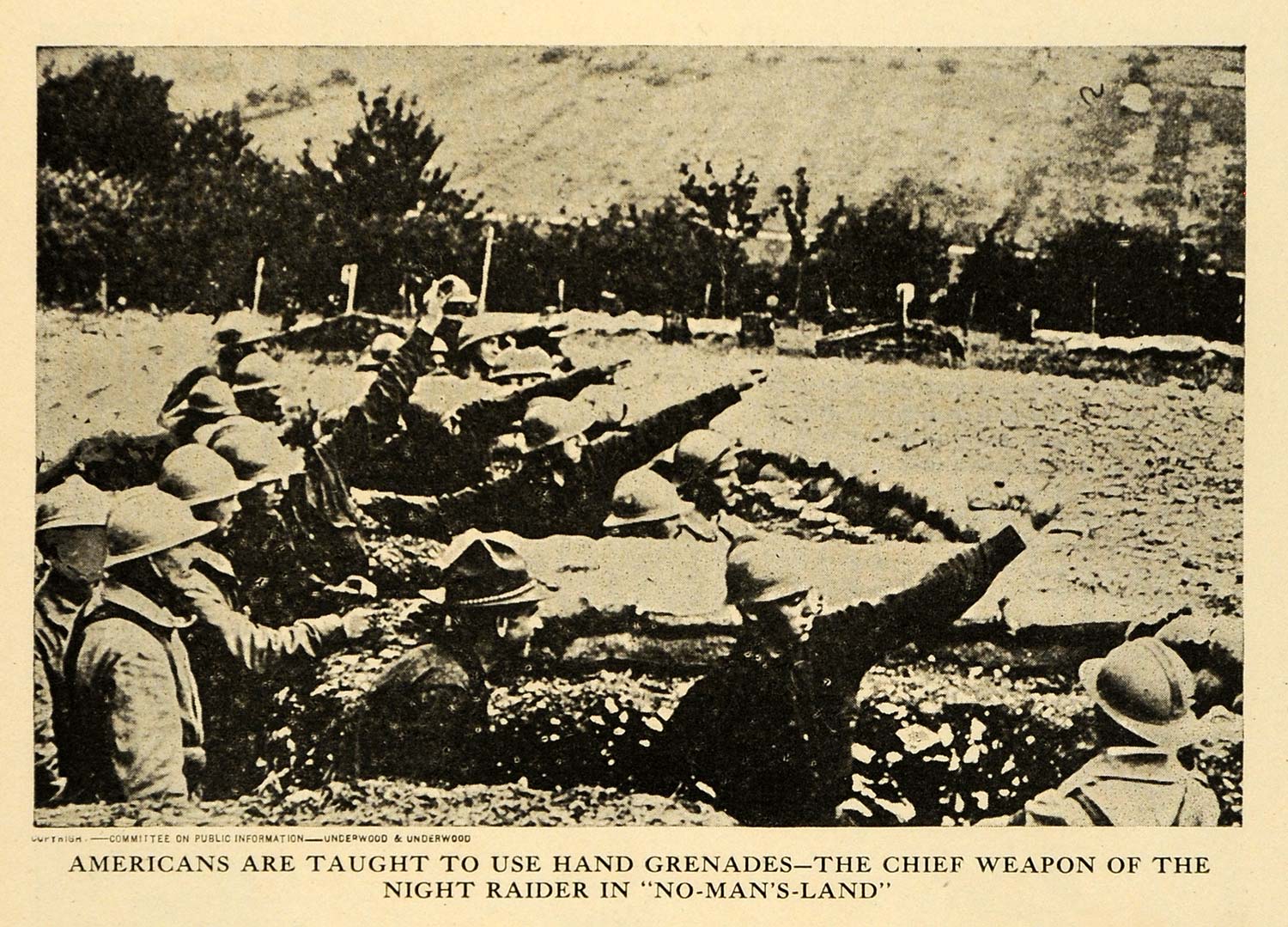 This is an original 1918 halftone print of American troops being taught how to properly toss a hand grenade from the trenches during World War I. This was the choice weapon during night raids in No-Man's-Land.