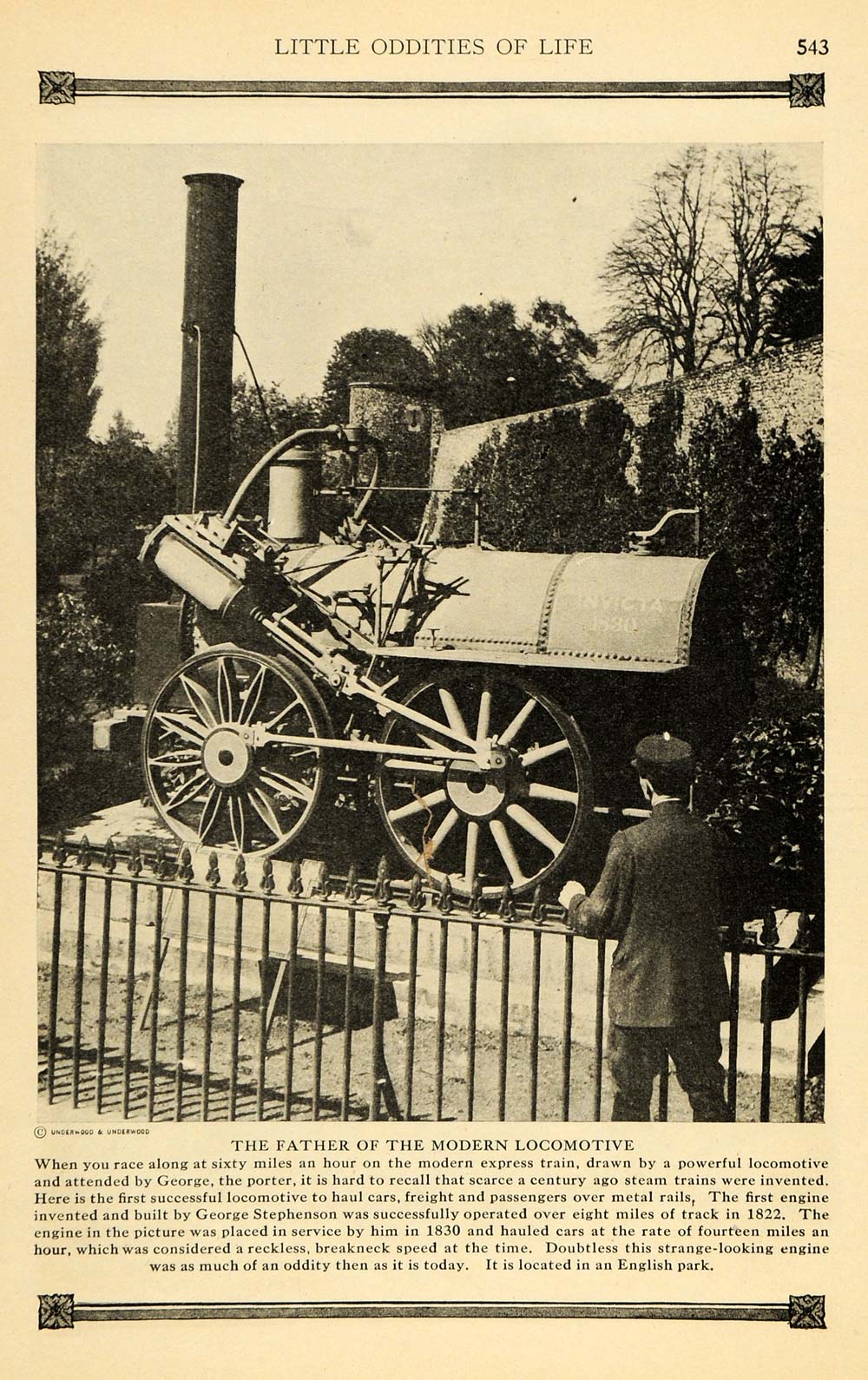This is an original 1918 halftone print of one of the earliest train locomotives on display in a park in England; it was invented and built by George Stephenson.