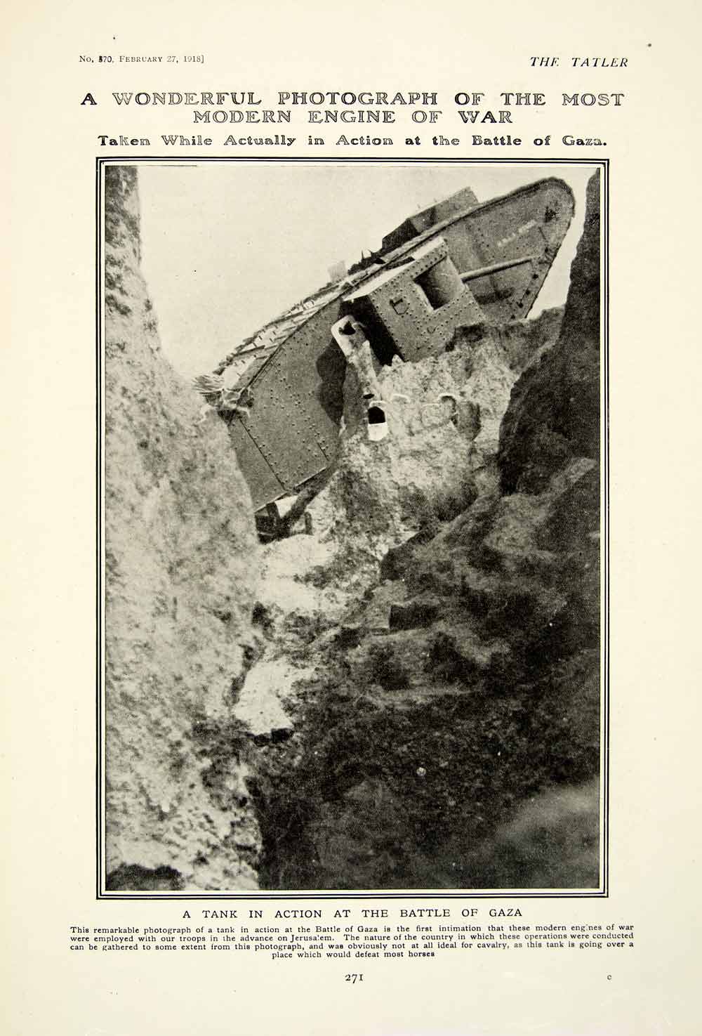 This is an original 1918 black and white halftone print of a military tank in action at the Battle of Gaza.
