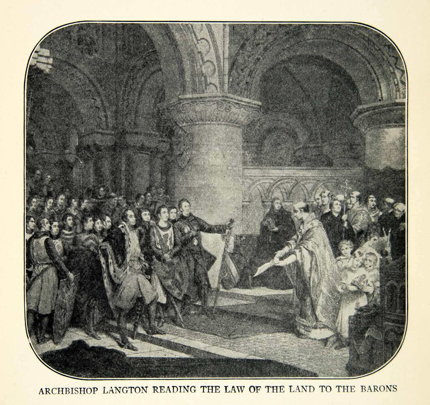 This is an original 1918 black and white halftone print of Archbishop Langton of England reading the Barons the charter of Henry I and requesting it be renewed.