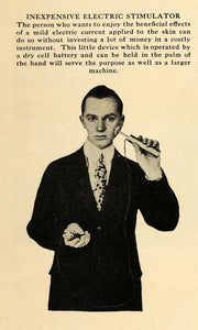 This is an original 1918 halftone print of a man using an electric stimulator. The caption reads, "The person who wants to enjoy the beneficial effects of a mild electric current applied to the skin can do so without investing a lot of money in a costly instrument."