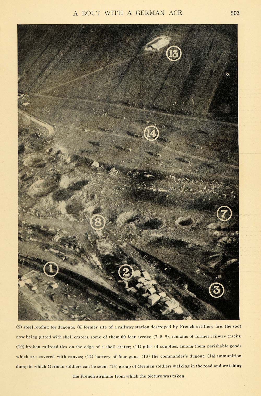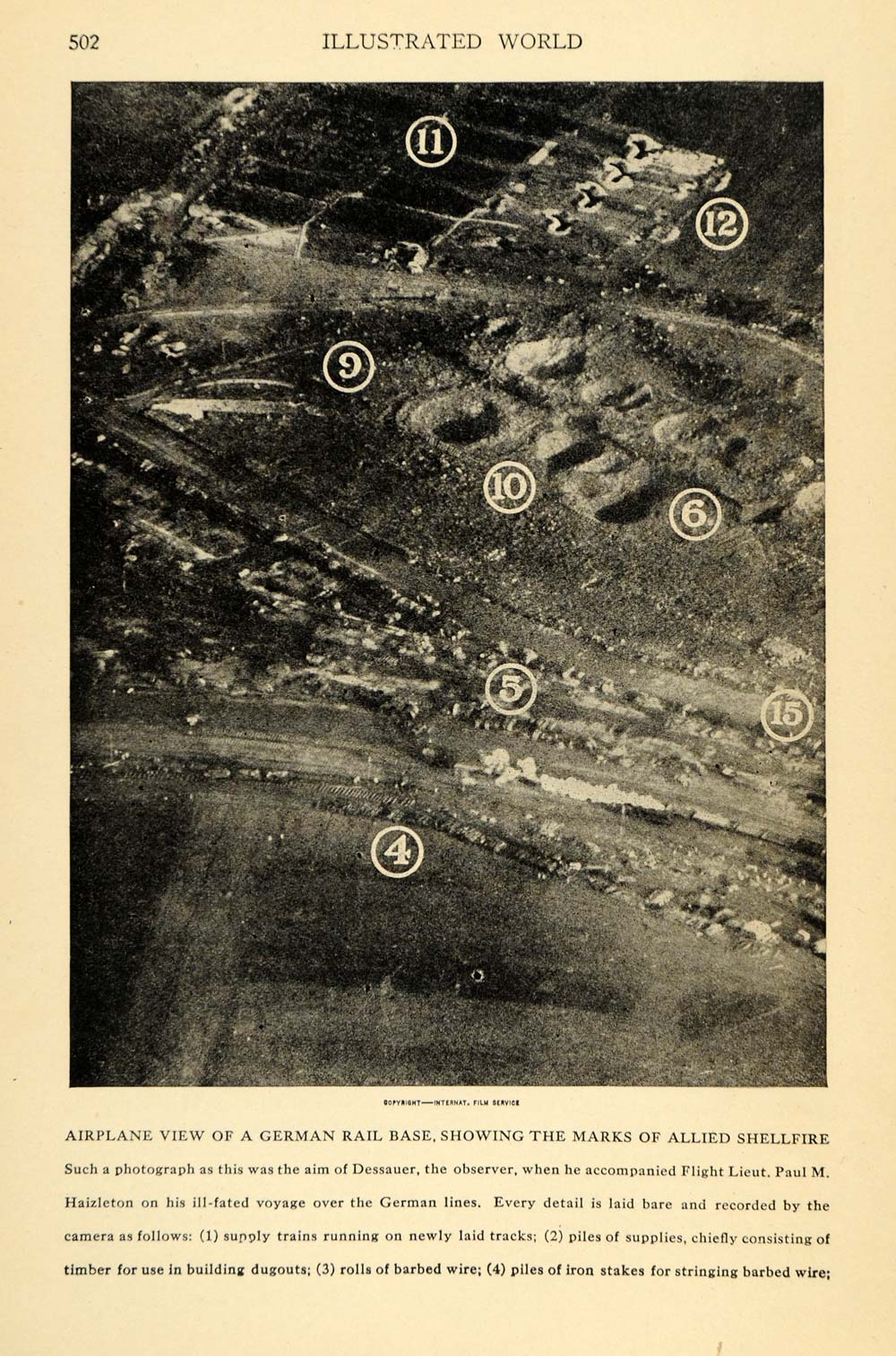 This is an original 1918 halftone print of an aerial view of a German rail base. The ad writes, "Such a photograph as this was the aim of Dessauer, the observer, when he accompanied Flight Lieutenant Paul M. Haizleton on his ill-fated voyage over the German lines."