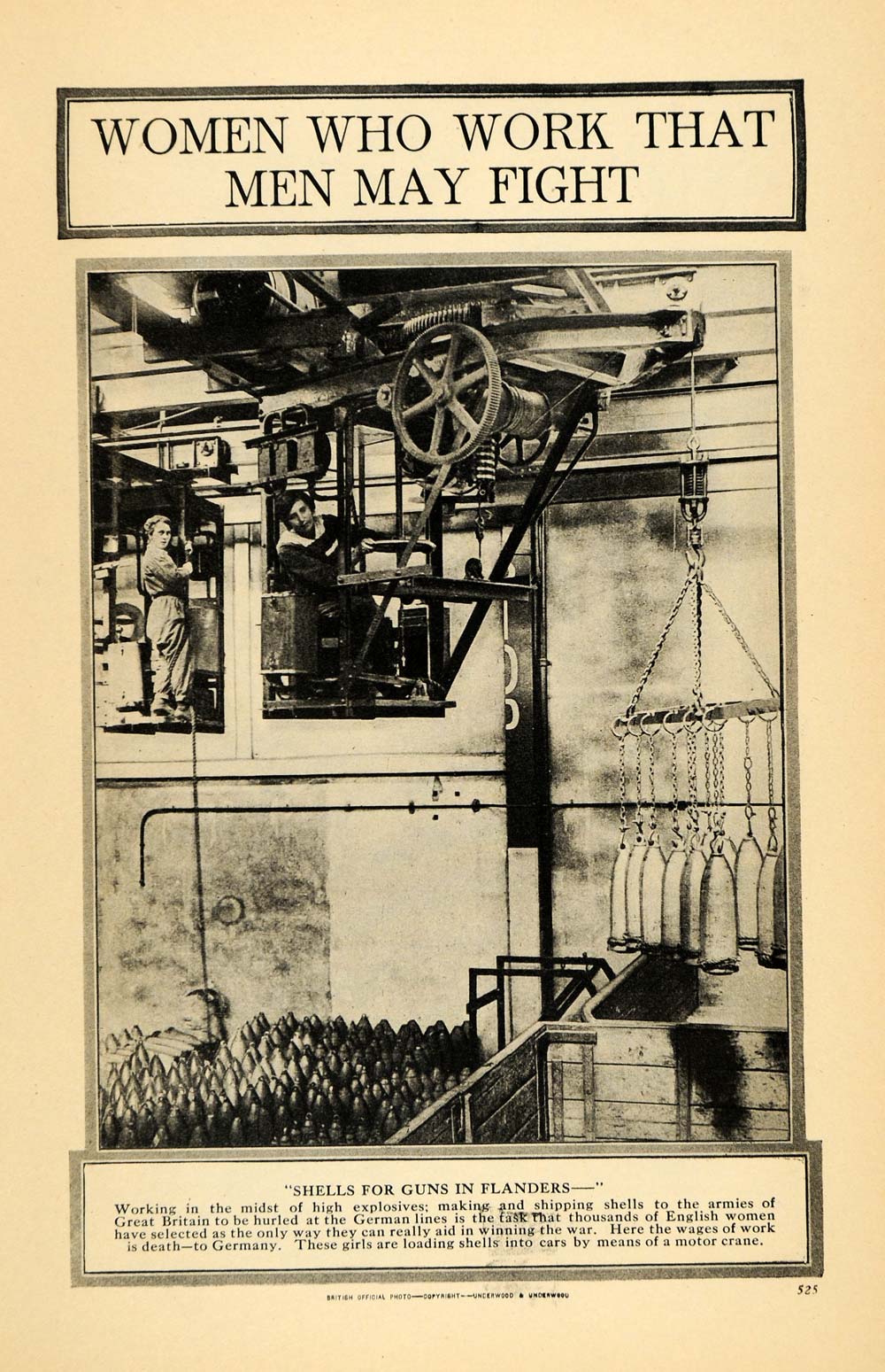 This is an original 1918 halftone print of women in the workforce in Great Britain. The women are loading explosive shells into shells to be shipped to the military. The caption reads, "Thousands of English women have selected as the only way they can really aid in winning the war. Here the wages of work is death-- to Germany."