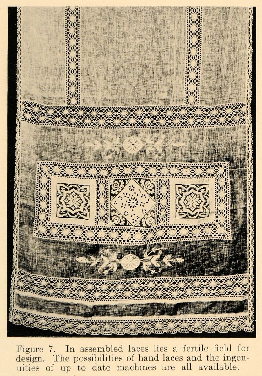 This is an original 1918 black and white print for machine made lace. This sample shows in assembled laces lies a fertile field for design. The possibilities of hand laces and the ingenuity's of up to date machines are all available.