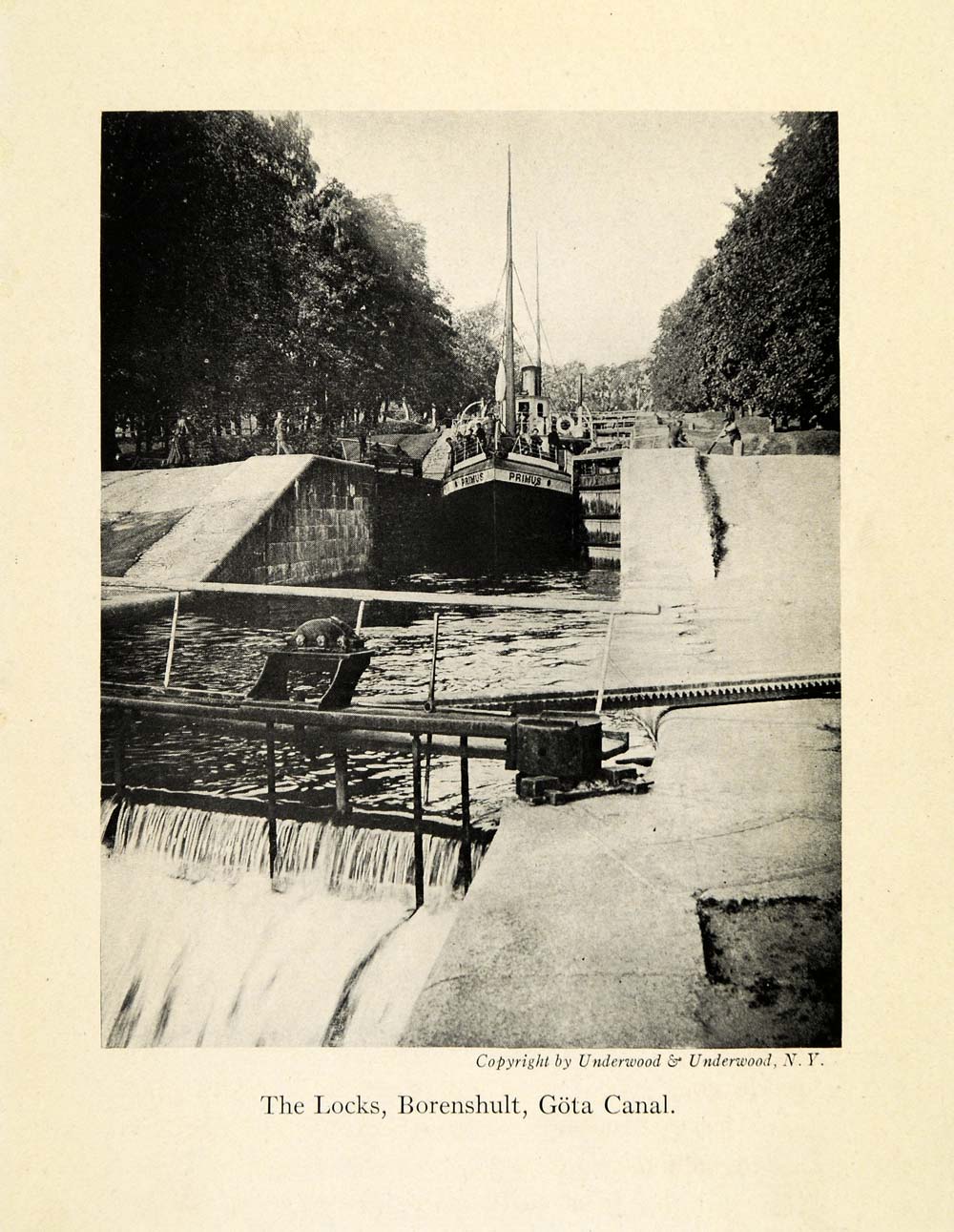 This is an original 1918 halftone print of the locks (water transports) of Lake Boren of the GÖta Canal in Borenshult, Sweden. Locks are fixed chambers unlike boat lifts or canal inclined planes. Borenshult has five lock steps in a row.