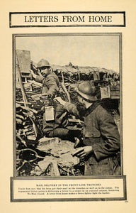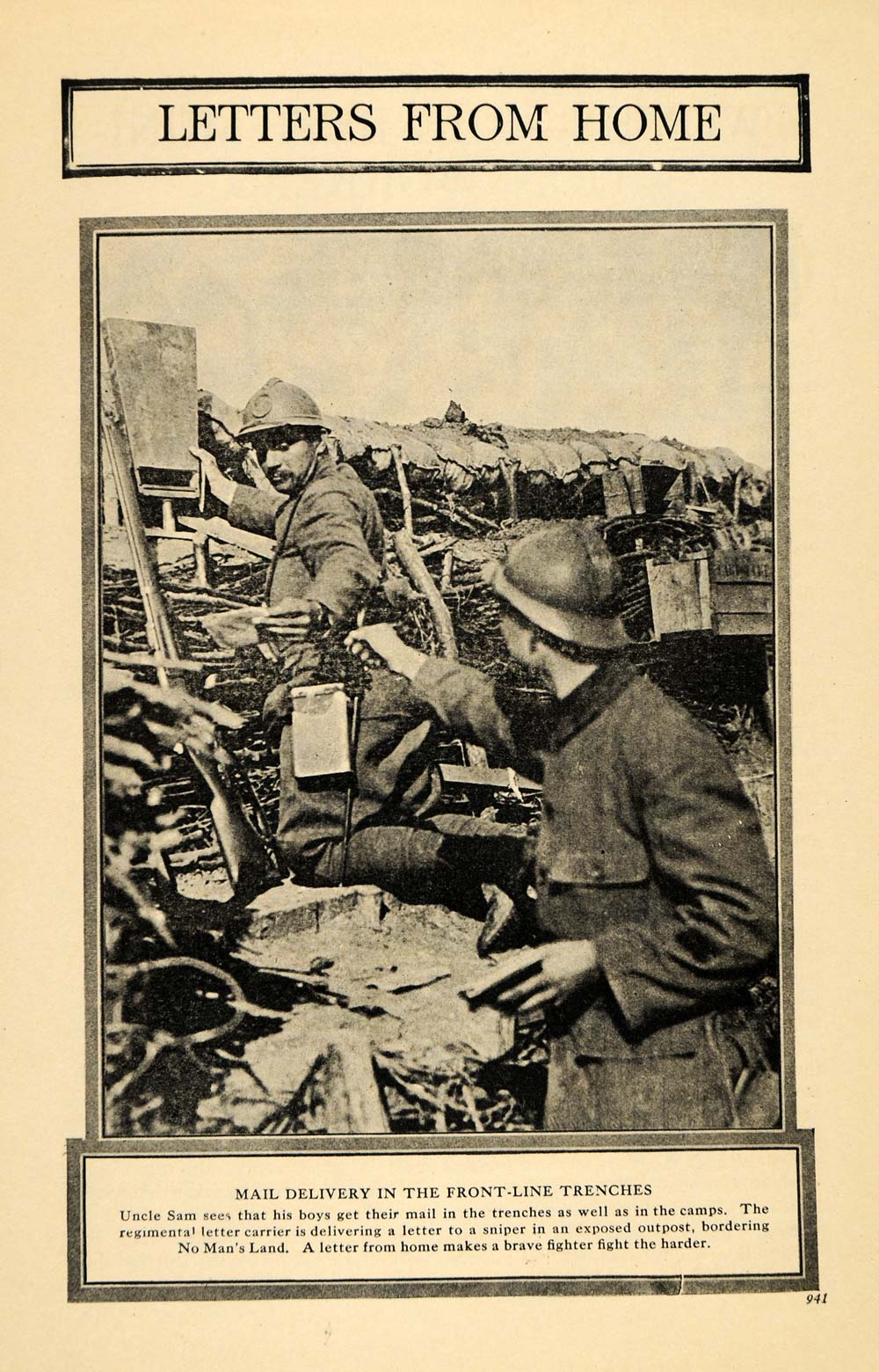 This is an original 1918 halftone print of mail being delivered in the trenches to the American boys. The caption reads, "The regimental letter carrier is delivering a letter to a sniper in an exposed outpost bordering No Man's Land."
