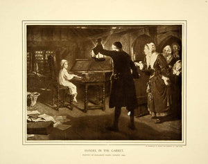 This is an original 1918 black and white halftone print of a painting by Margaret Isabel Dicksee that portrayed Baroque music composer George Frideric Handel playing the piano in the attic as a child.