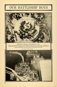 This is an original 1918 halftone print of a Memorial Day Service being held onboard a battleship for those who had lost their lives at sea in World War I. After the moment of silence and recollection, the ship was then transformed into a movie theater for the entertainment of the servicemen.