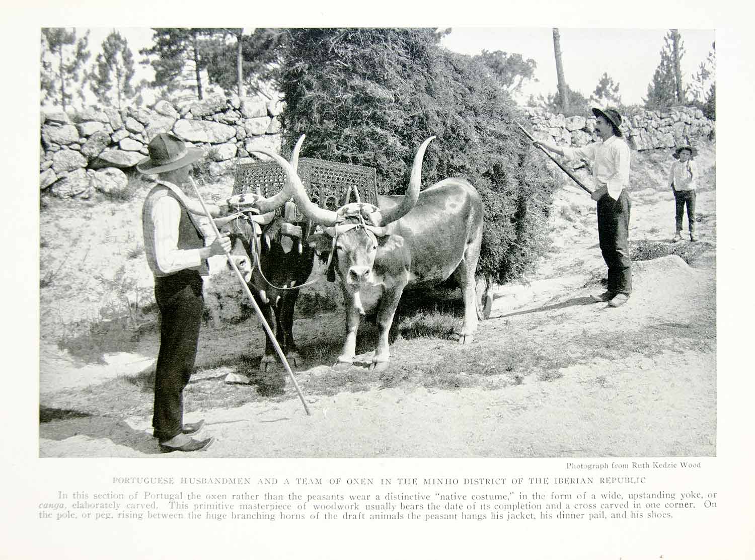 This is an original 1918 black and white halftone print of Portuguese farmers and a team of oxen in the Minho District of Portugal. The oxen are wearing the distinctive carved wooden yoke or "canga".