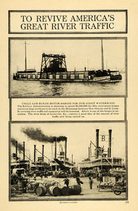 This is an original 1918 halftone print of motor barges being designed and constructed by the Railway Administration for transport and shipping purposes along the Mississippi River between New Orleans and St. Louis. The bottom image is of the river port at Louisville, Kentucky, bustling with water traffic.