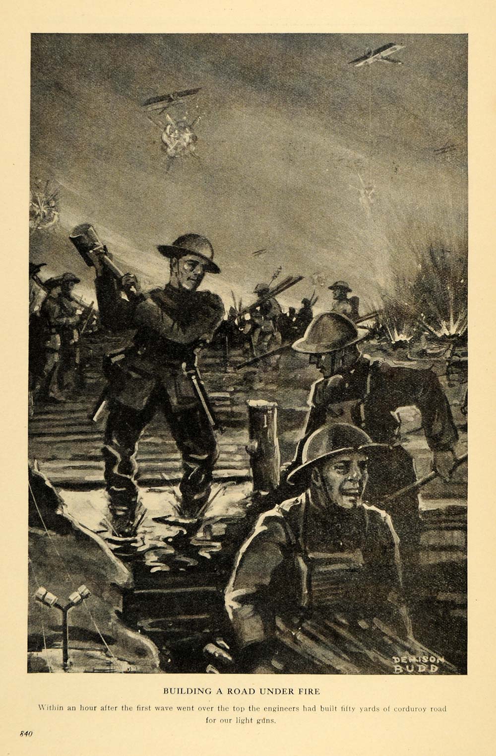 This is an original 1918 halftone print of a "Building A Road Under Fire," by Denison Budd. The caption reads, "Within an hour after the first wave went over the top the engineers had built fifty yards of corduroy road for our light guns."