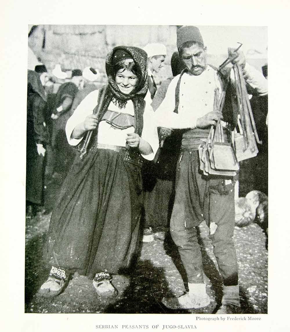 This is an original 1918 black and white halftone print of typically dressed Serbian peasants in Yugoslavia (former).