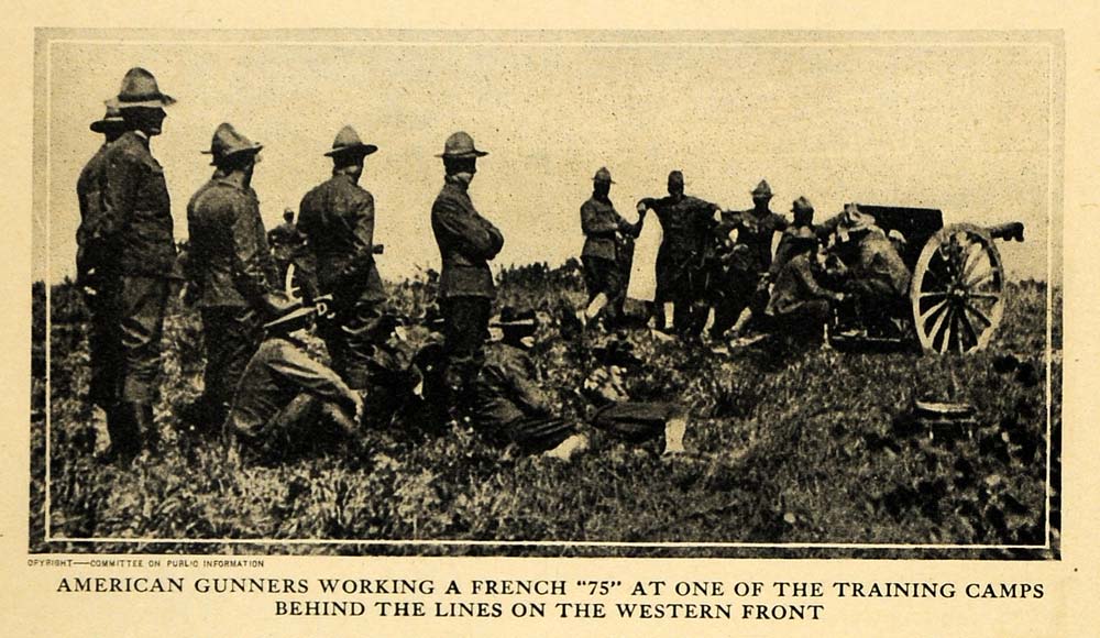This is an original 1918 halftone print of American gunners working on a French gun behind the lines on the Western front during World War I.