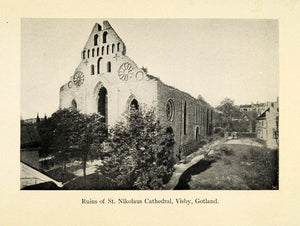 This is an original 1918 halftone print of the ruins of St. Nicholas (Nikolaus) Church/Cathedral in Visby, Gotland County, Sweden. Originally a Dominican monastery, it now serves as the location for the performance of the mystery play "Petrus de Dacia."