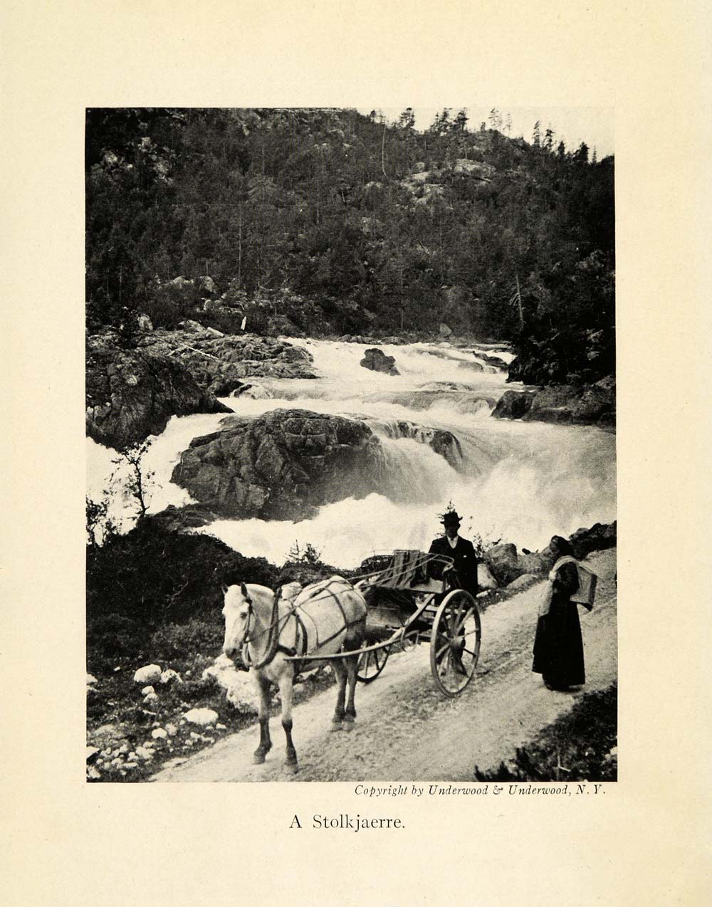 This is an original 1918 halftone print of a stolkjaerre, a 2-wheeled cart used in Norway. Unfortunately, we are unsure as to the exact location of this image.