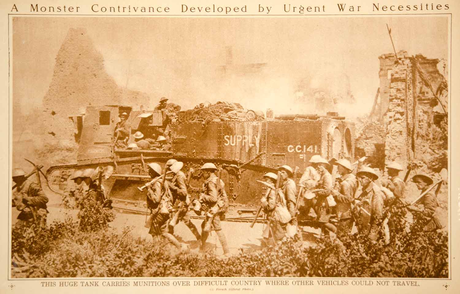This is an original 1918 sepia rotogravure of a huge tank moving munitions over difficult terrain during World War I.
