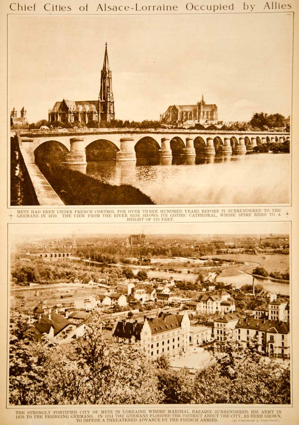 This is an original 1918 sepia rotogravure with two views of the city of Metz in Alsace-Lorraine. In November 1918, at the end of World War I, the region of Alsace-Lorraine passed from German to French sovereignty.