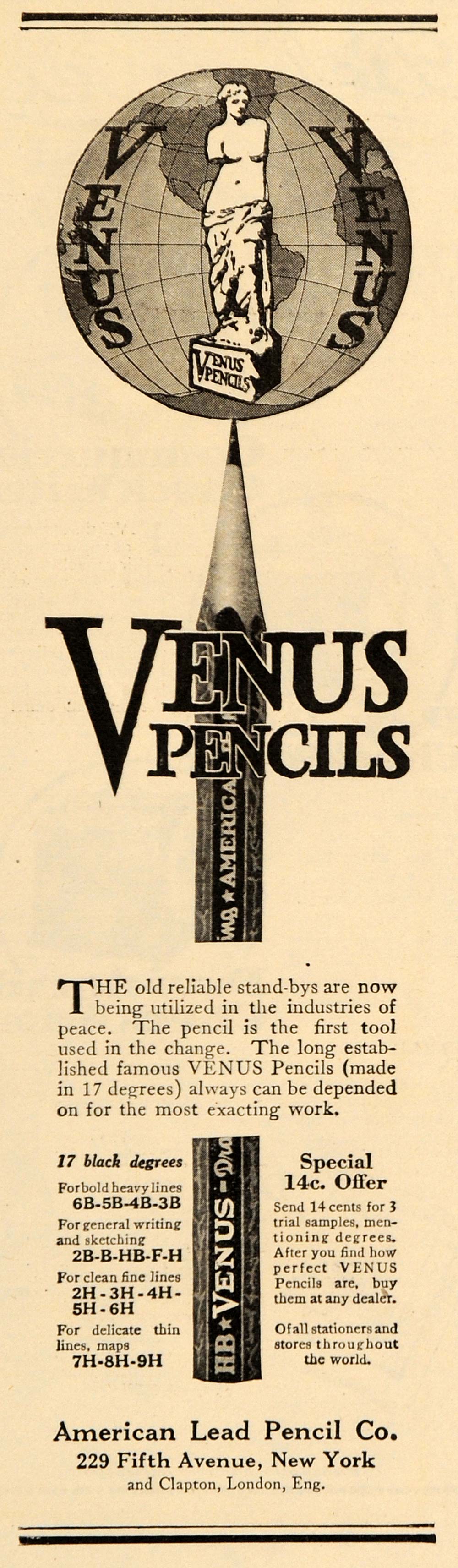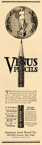 This is an original 1919 black and white print ad for the American Lead Pencil Company, located at 229 Fifth Avenue in New York, and Clapton, London. This ad features their Venus Pencils.