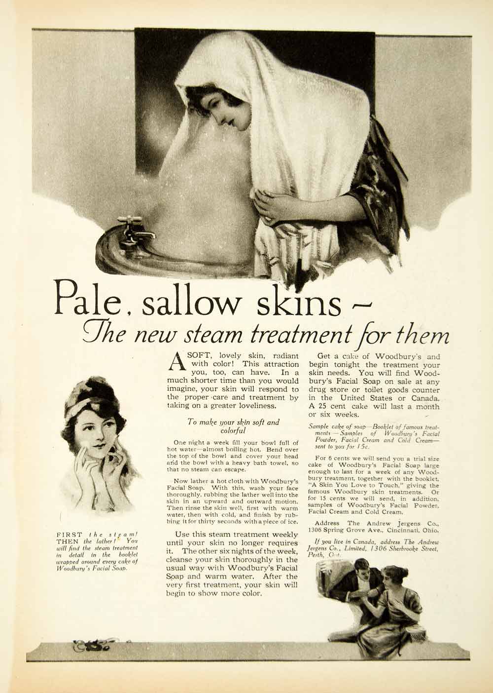 This is an original 1919 black and white print ad for the steam treatment method and Woodbury's Facial Soap from the Andrew Jergens Company, who were located at 1306 Spring Grove Avenue, Cincinnati, Ohio.