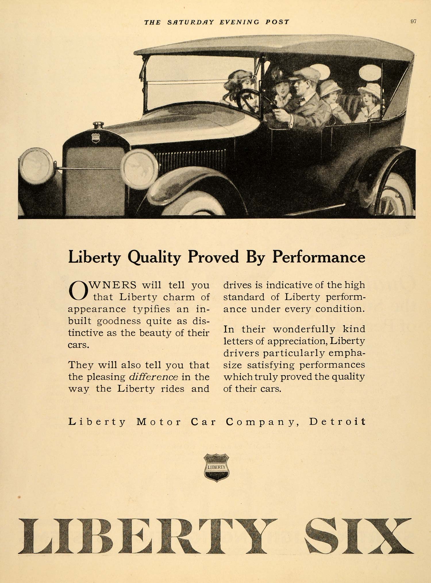 This is a rare original 1919 black and white print ad for Liberty Motor Car Company in Detroit. The Liberty Six model was the sole model this company ever offered. It was only in operation from 1916 to 1924, when the company was bought by Columbia Motors.