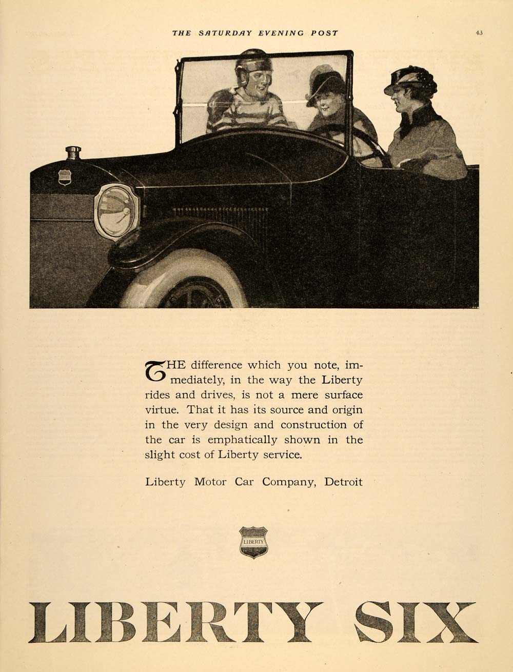 This is a rare original 1919 black and white print ad for Liberty Motor Car Company in Detroit. The Liberty Six model was the sole model this company ever offered. It was only in operation from 1916 to 1924, when the company was bought by Columbia Motors.