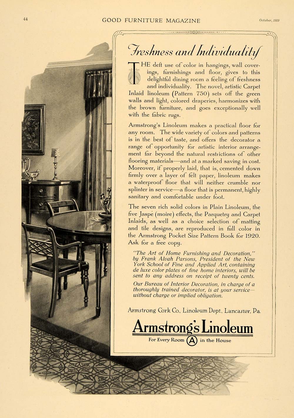This is an original 1919 black and white print ad for the Armstrong Cork Company's Linoleum Department of Lancaster, Pennsylvania. This ad features their Armstrong Linoleum, in Plain and Jaspe/Moire styles, and Parquetry and Carpet Inlaid.
