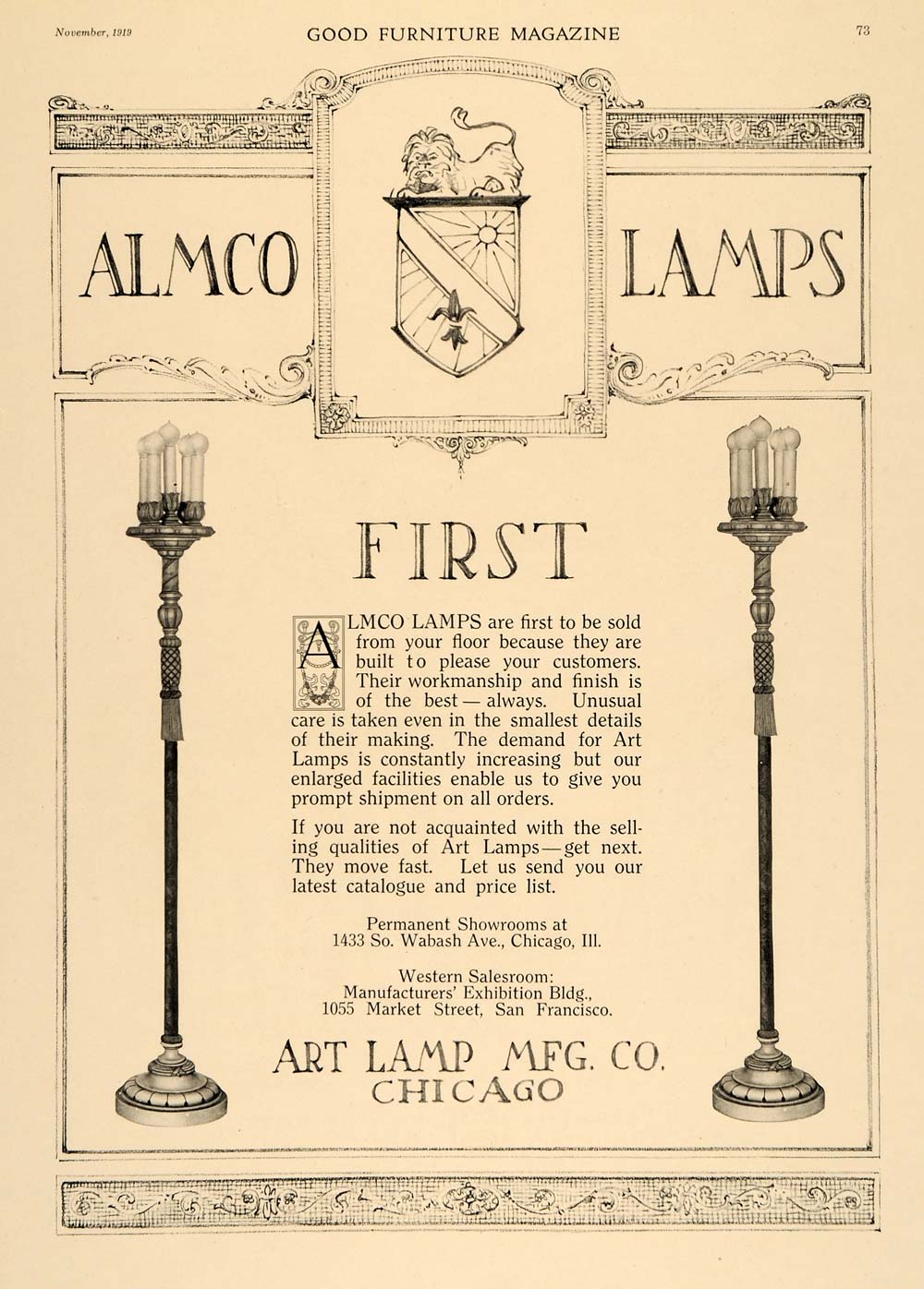 This is an original 1919 black and white print ad for the Art Lamp Manufacturing Company, located in Chicago, Illinois. This ad features their Almco Lamps. Their showrooms are located at 1433 So. Wabash Avenue in Chicago, and 1055 Market Street in San Francisco.