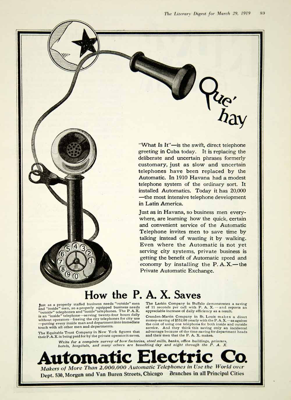 Keywords specific to this image: Vintage Advertising, Company, Street, Illinois, IL, Que' Hay, Spanish, Cuba, Phone, Rotary Dial, Telecommunications, Appliance, Electronics, Device, Microphone, Transmitter, Utilities, Desk Stand, Upright, Stick, Mouth Piece, Ear Phone, Receiver, Switch Hook, Network