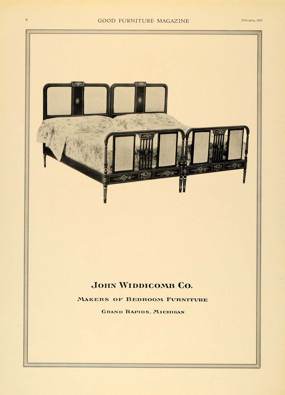 This is an original 1919 black and white print ad for bedroom furniture by the John Widdicomb Company located in Grand Rapids, Michigan.