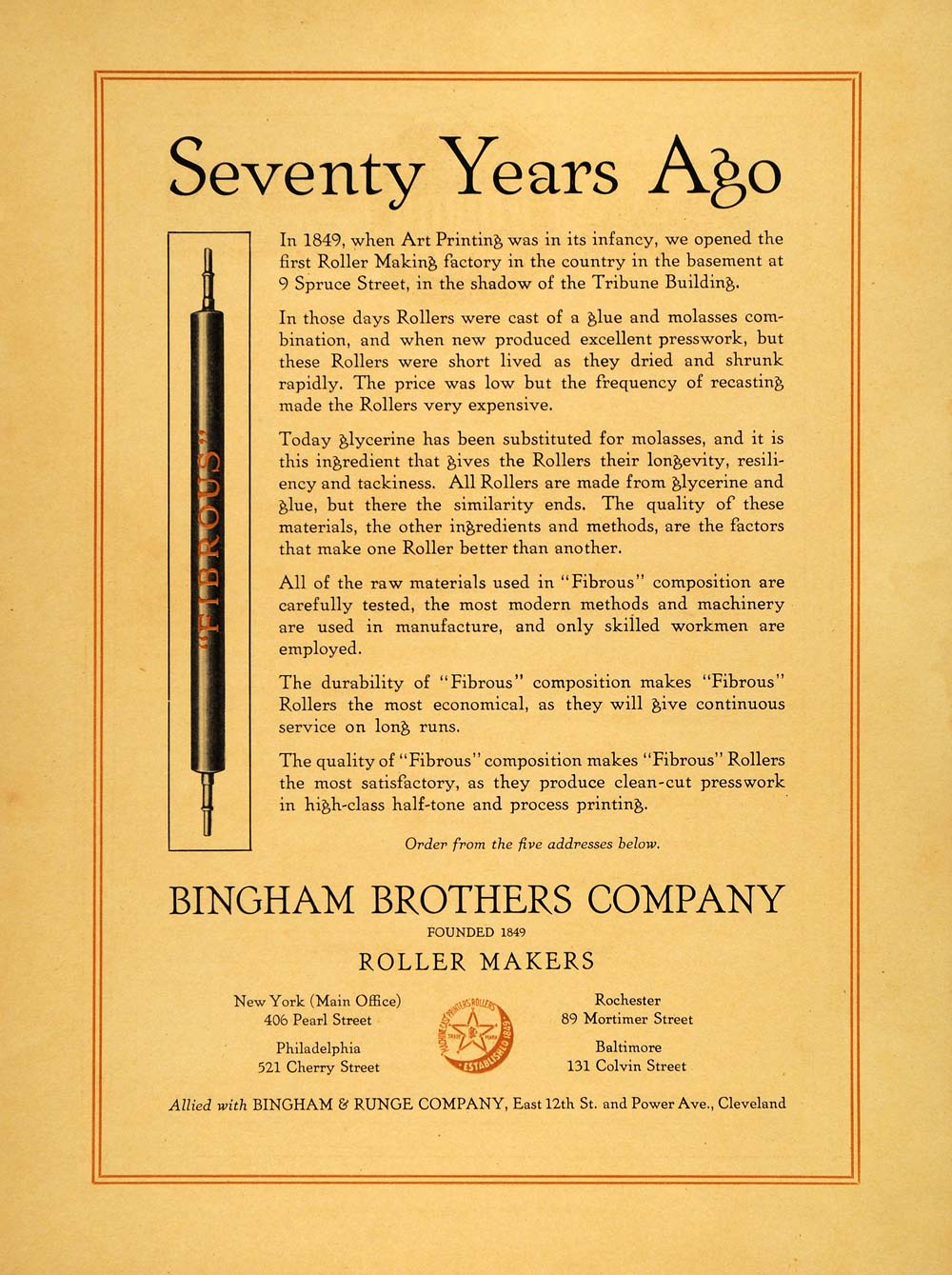 This is an original 1919 color print ad for the Bingham Brothers Company, Roller Makers locates at 406 Pearl Street, New York.