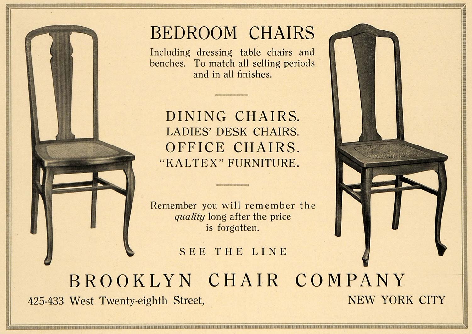 This is an original 1919 black and white print ad for the Brooklyn Chair Company, located at 425-433 West 28th Street in New York City, New York. This ad features their bedroom, dining, and desk chairs.