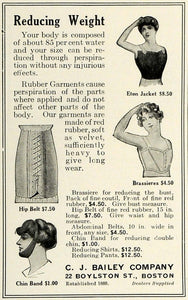 This is a small original 1919 black and white print ad for C. J. Bailey's line of Weight Reducing undergarments, including the Eaton Jacket, Brassieres, Hip Belts and Chin Bands.