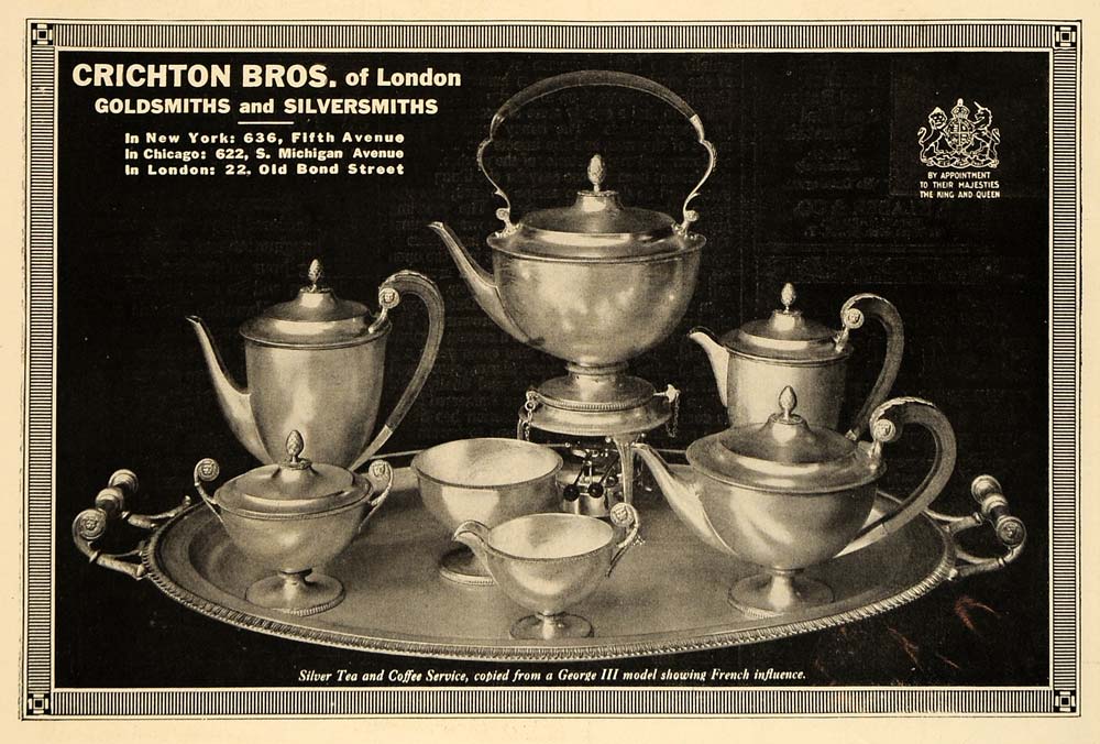 This is an original 1919 black and white print ad for a silver tea and coffee service, copied from a George III model showing French influence by Crichton Brothers of London. Locations at 636 Fifth Avenue, New York City, New York; 622 S. Michigan Avenue, Chicago, Illinois; 22 Old Bond Street, London.
