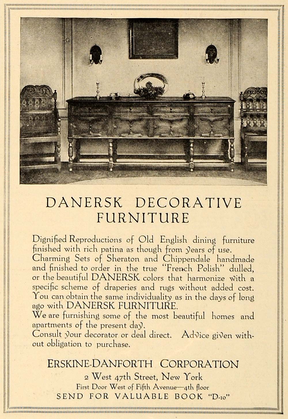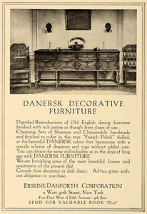 This is an original 1919 black and white print ad for Danersk Decorative Furniture by Erskine-Danforth Corporation located at 2 West 47th Street, New York City, New York.
