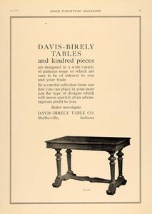 This is an original 1919 black and white print ad for the Davis-Birely Table Company of Shelbyville, Indiana. This ad features their "kindred pieces" and fine woodwork tables.