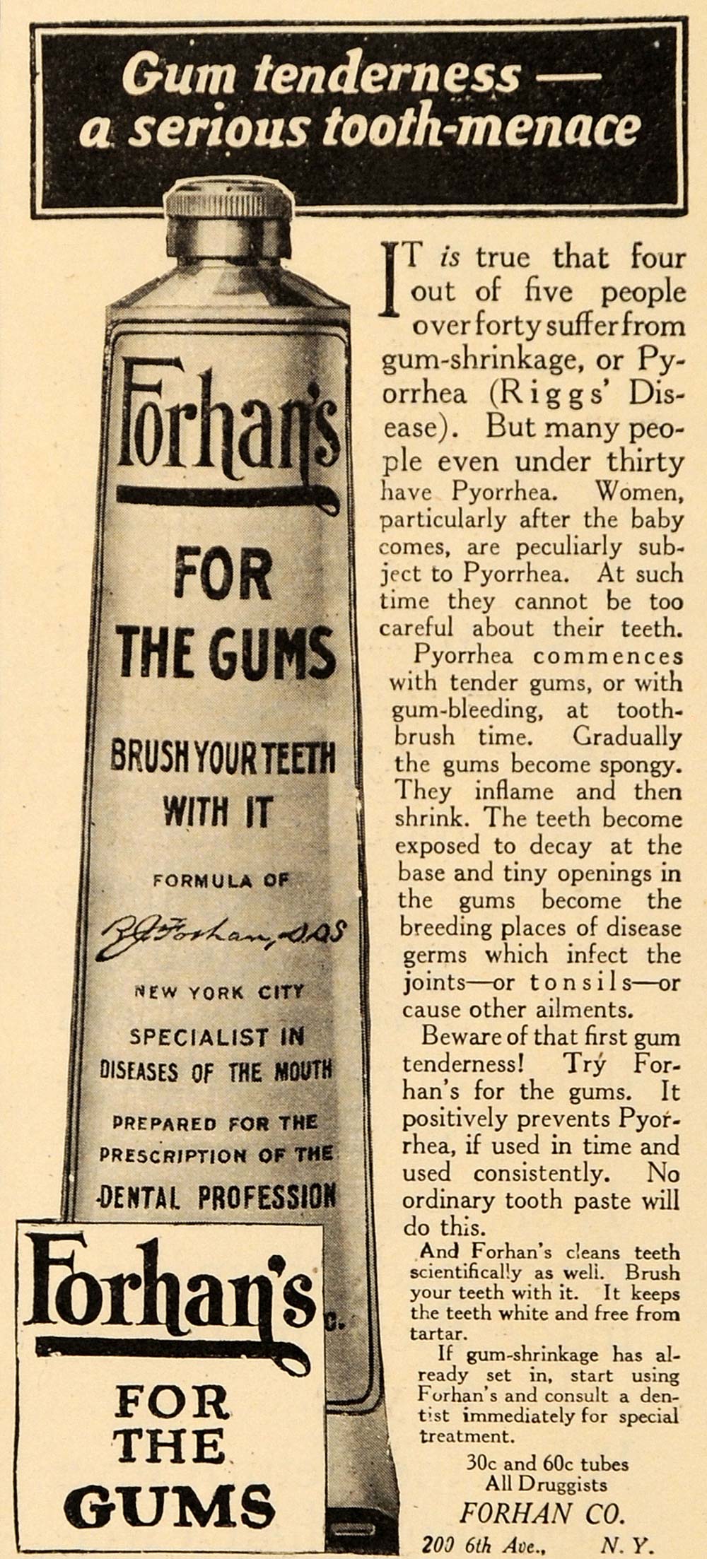 This is an original 1919 black and white print ad for the Forhan Company, located at 200 6th Avenue in New York. This ad features their Forhan's gum relief mouth toothpaste.