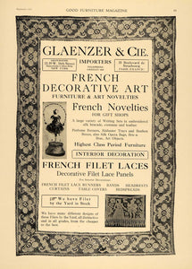 This is an original 1919 black and white print ad for Glaenzer & Cie, Importers of French Decorative Art, Furniture and Art Novelites.