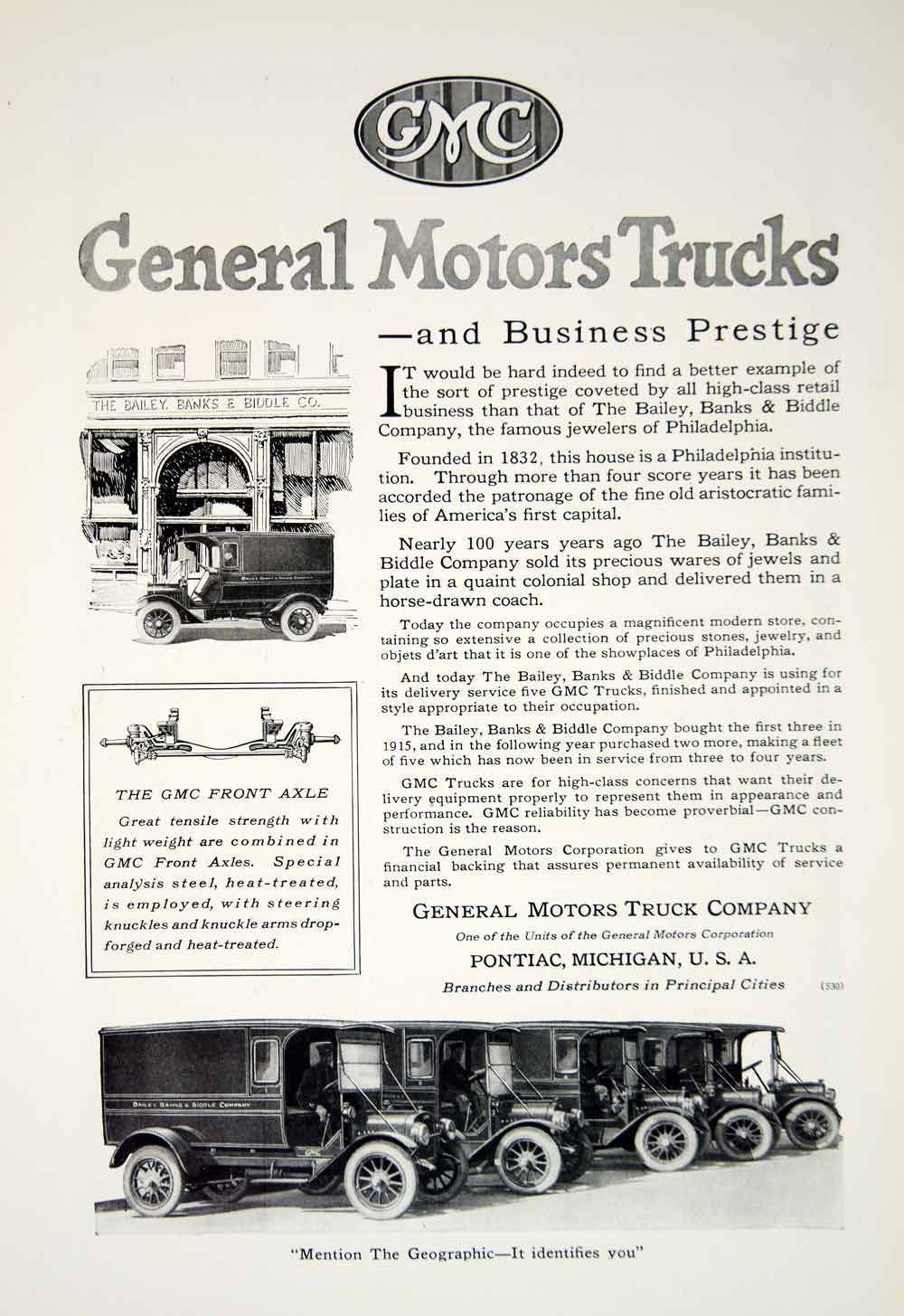 This is an original 1919 black and white print ad for the General Motors Truck Company, featuring the Baily, Banks & Binddle Company who use GMC trucks to haul their precious jewels around the city of Philadelphia.