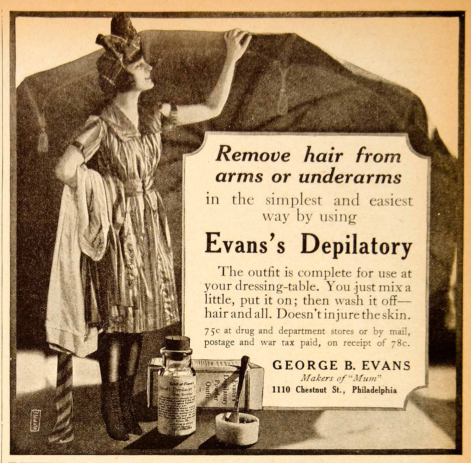 This is an original 1919 monochrome print ad for Evans's Depilatory Hair Removal.