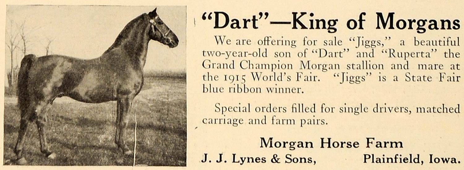 This is an original 1919 black and white print ad for horses from Morgan Horse Farm by J. J. Lynes and Sons located in Plainfield, Iowa.