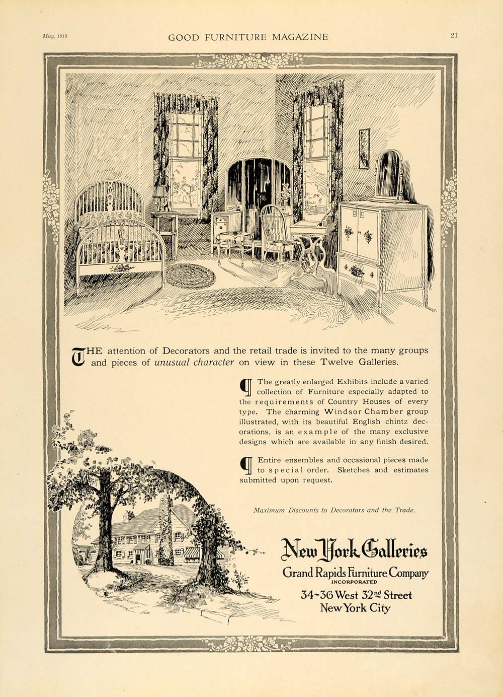 This is an original 1919 black and white print ad for the New York Galleries, Grand Rapids Furniture Company, Incorporated located at 34-36 West 32nd Street, New York City.