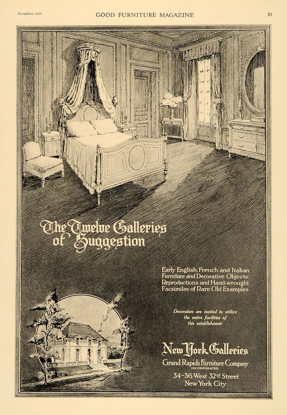 This is an original 1919 black and white print ad for the New York Galleries of the Grand Rapids Furniture Company, Incorporated, located at 34 - 36 West 32nd Street in New York City. They offer Early English, French, and Italian furniture and decorative objects for the home.