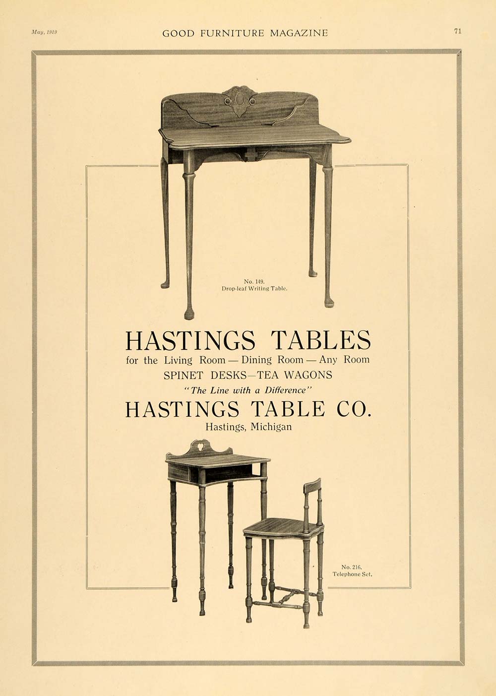 This is an original 1919 black and white print ad for the Hastings Table Company of Hastings, Michigan. The ad features their Drop-leaf writing table and wooden telephone table and chair set.