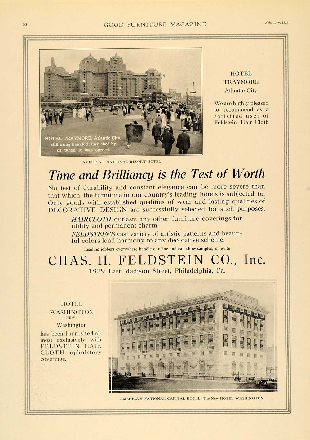 This is an original 1919 black and white print ad for Feldstein Haircloth furniture coverings by Chas. H. Feldstein Company, Inc. located at 1839 East Madison Street, Philadelphia, Pennsylvania. There is a picture of both the Hotel Traymore located in Atlantic City and The Hotel Washington both are furnished with Feldstein Haircloth upholstery coverings.