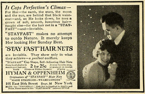 This is a small original 1919 black and white print ad for the Stay Fast Hair Nets from Hyman and Oppenheim located at 105 East 16th Street, New York City.