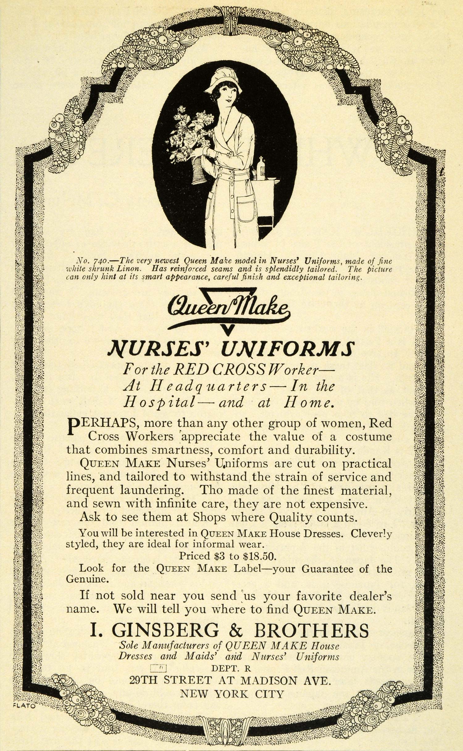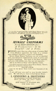 This is an original 1919 black and white print ad for Queen Make Nurses' Uniforms for the Red Cross worker by I. Ginsberg & Brothers. They are located at 29th Street at Madison Avenue, New York City, New York. The uniform shown is No. 740.